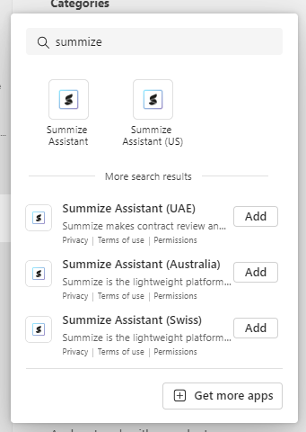 - Add the appropriate ‘Summize Assistant’ Teams integration
