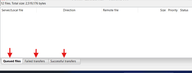 - Monitor Transfer: You can monitor the progress of the file transfer at the bottom of the FileZilla window under the "Queued files," "Failed transfers," and "Successful transfers" tabs.