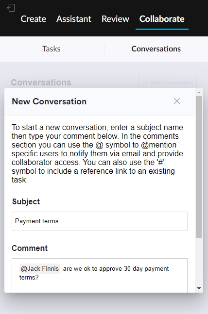 To start a conversation, click 'New conversation' and complete the subject and the comment, and click 'Start Conversation':