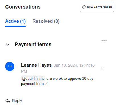 You can start or reply to conversations within the add-in, too. In the example below, there are no conversations associated with the Request: