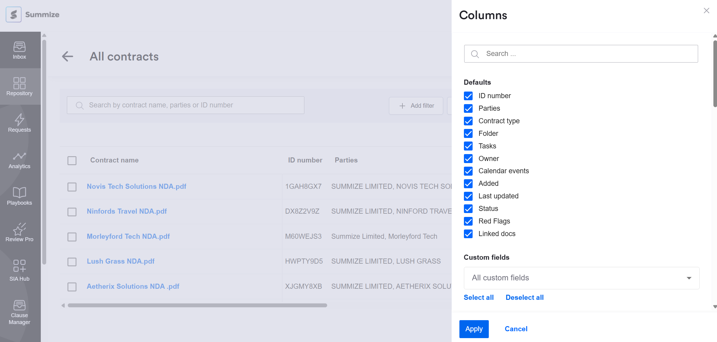 To see an overview of specific clauses on your Repository table, tab on the clauses you'd like to see and click "Apply" (as seen in the image below). Clauses can be found right under Default Columns shown in the previous image.