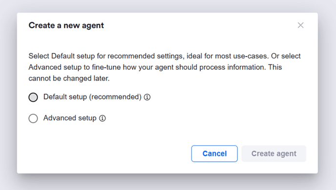 Select the setup required and click ‘Create agent’. For majority of use cases, we recommend the default setup. The advanced setup option allows customisation for chunk size and overlap settings – we only recommend using this option if these terms are familiar to you!
