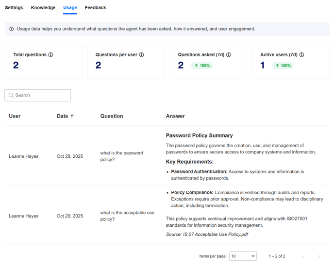 In ‘Usage’, you can see the questions that have been asked and the responses that the agent gave. You can also see some stats around volume of questions asked and number of users who have asked questions.