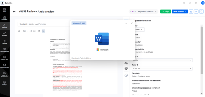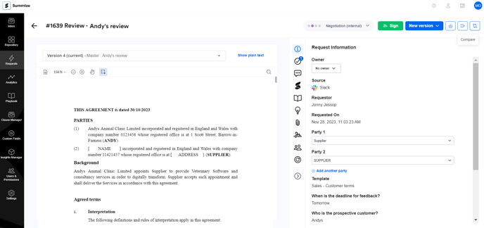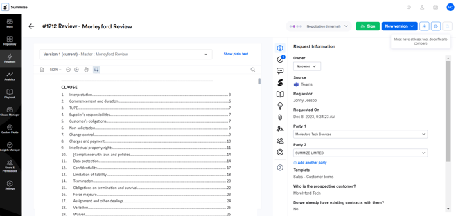 Comparing two versions of a contract is simple in Summize. To begin the process, go to 'Requests' on the left hand menu of the Summize web app. Navigate to the contract you want to compare and click on the contract to open it.