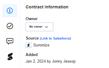 - Manually via the webapp using the ‘Link to Salesforce’ option shown below. Navigate to the Repository contract, click on the 'i' Icon in the panel, and click 'Link to Salesforce'.