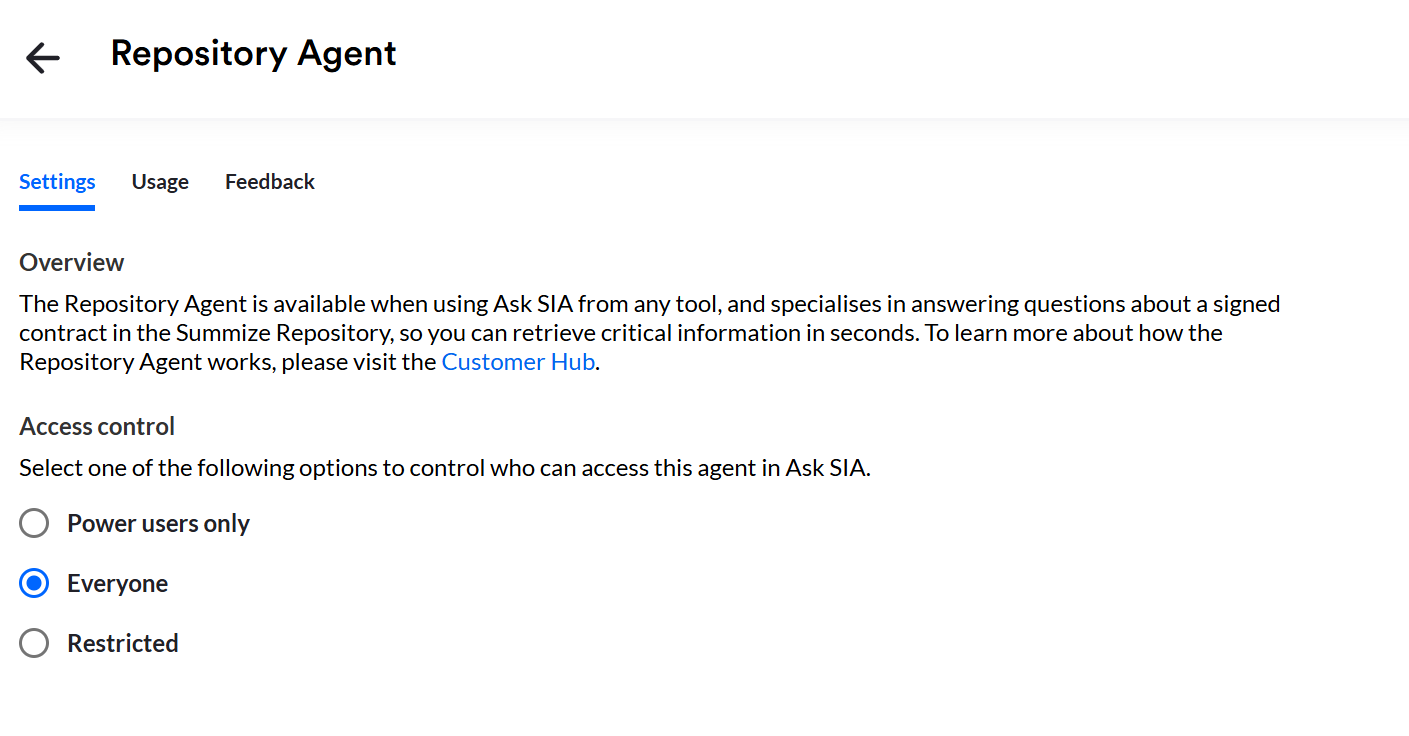 You can monitor usage and answer feedback of the Summize agents using the ‘Usage’ tab and the ‘Feedback’ tab.