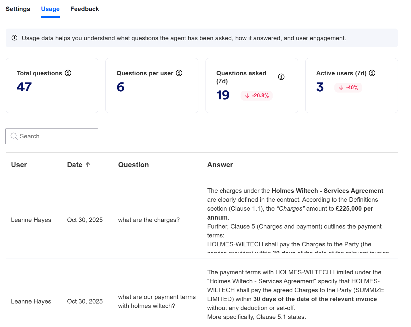 In ‘Usage’, you can see the questions that have been asked and the responses that the agent gave. You can also see some stats around volume of questions asked and number of users who have asked questions.