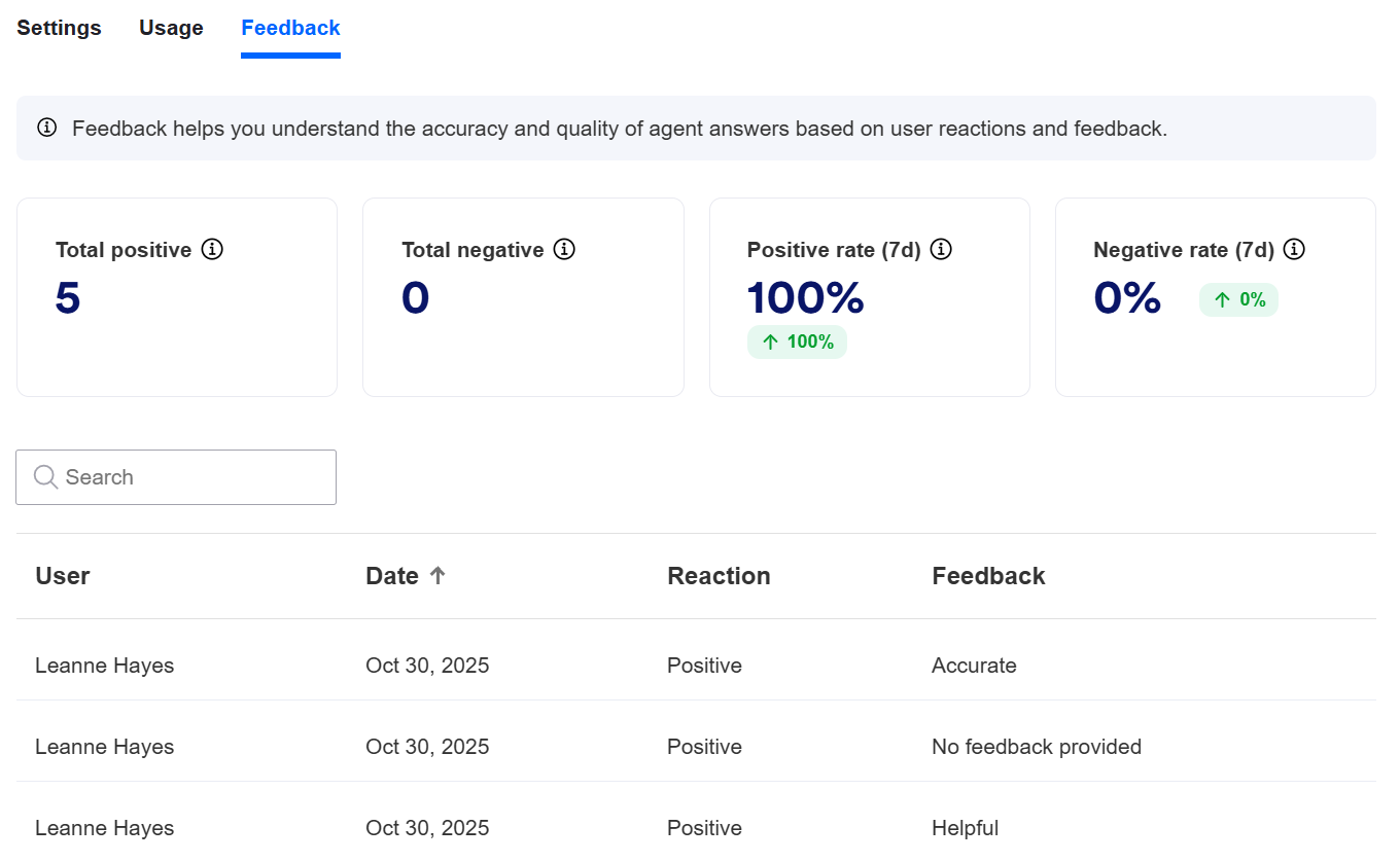 In ‘Feedback’, you can see any thumbs up/down responses that your users have given, alongside any reasoning they have provided. You can also see stats around overall positive versus negative responses.