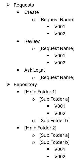Within Requests, there will be a folder each for Create, Review and Ask Legal.