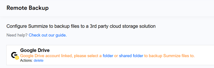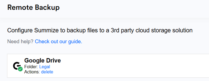 - A green tick indicates that the account is linked and authenticated. In this case, any file uploaded to Summize will also be backed up to the folder in the linked account.