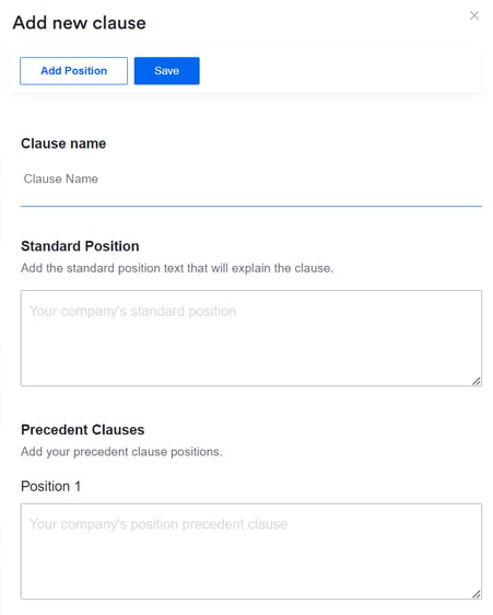 Enter the Clause name and the positions that you want to populate. If you want to add more than the standard position and the first precedent clause, click 'Add Position' - this will add a new text box for subsequent positions: