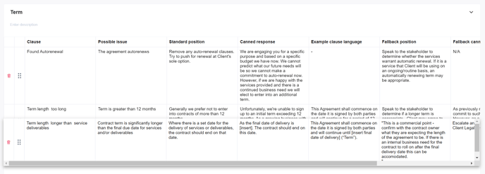 To edit an existing clause, click anywhere on the row you want to edit to open the side panel. Here, you can make your changes and click 'Save' once finished.