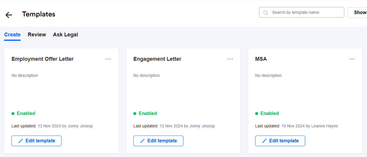 Clicking "Templates" will open up this page with a list of all your Create, Review and Ask Legal templates.