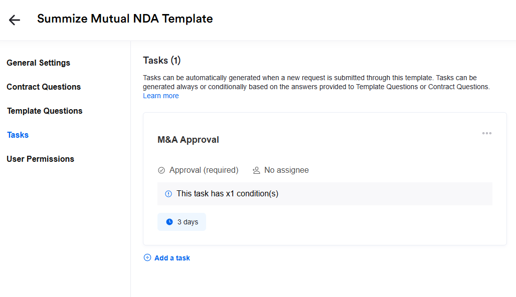 Conditional tasks can be built into Create, Review and Ask Legal request templates to further enhance your workflows, and to ensure the appropriate requests are assigned to the appropriate person, based on responses given during the request process.