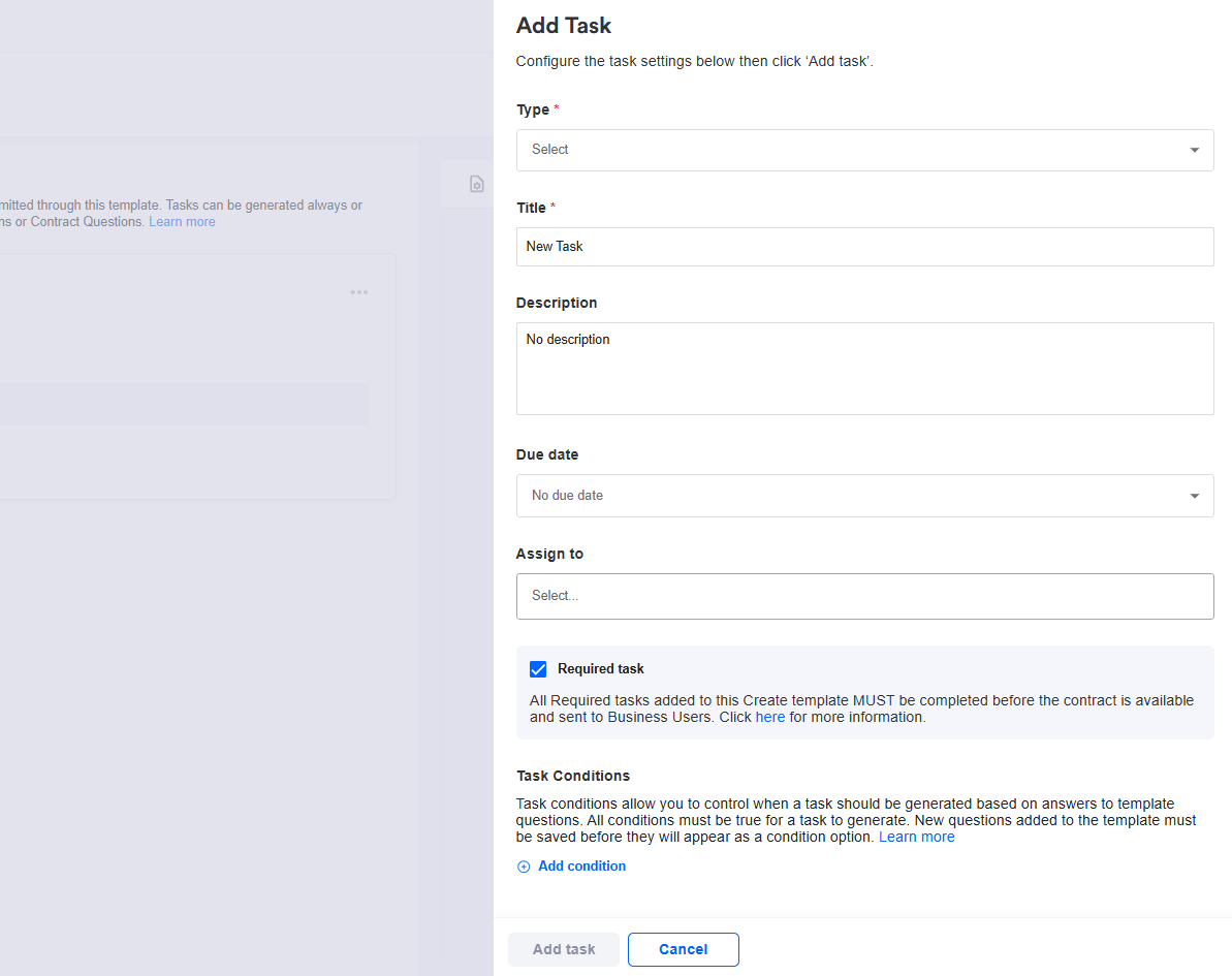 This functionality allows you to control when a task should be generated based on the answers to questions in your request templates. For Create requests, conditional questions can be based on both template questions and contract questions.