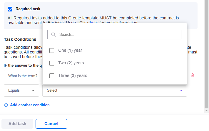 As seen in the image below, the "Add condition" and "Add another condition" buttons allow you to add diverse types of conditions that assign automated tasks to individual users or user groups whenever contracts are generated.