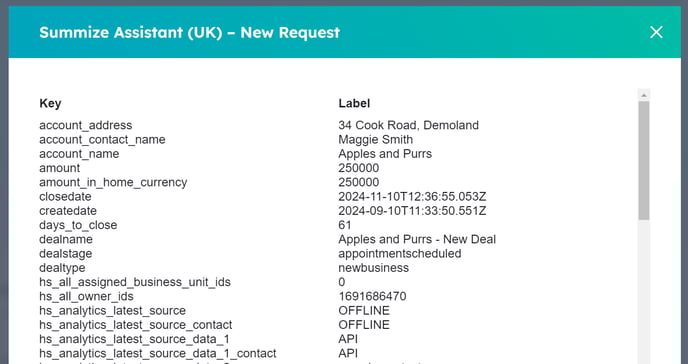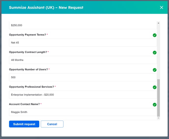 Now, when you start a Request in HubSpot, the fields that are mapped which have values in the Deal/Company will now be prepopulated, meaning the user only needs to fill out any empty fields: