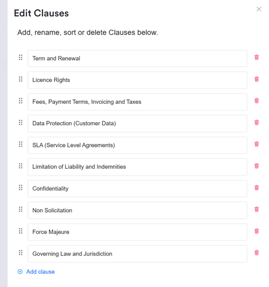 Replace 'New Clause' with the name of your first clause, and continue to add until you've listed everything that you would typically focus on when manually reviewing this contract type: