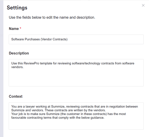 Next, you will want to give Review Pro the appropriate context in order to perform a contract review. Review Pro already knows how to review a contract, so think of this as the guidance you would give a new starter in the team before they perform their first manual contract review to help them understand points like: