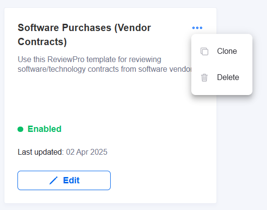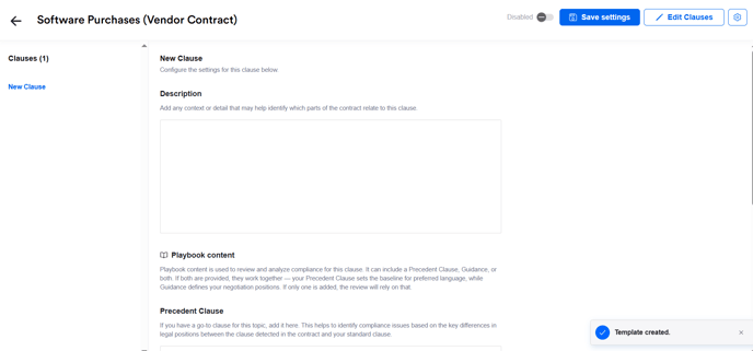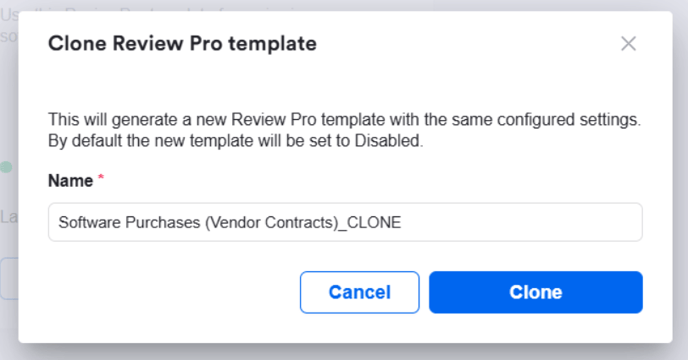 Cloning a template will duplicate all settings from the original, which is particularly useful if you want to create two versions of a Review Pro template, using the same clauses but with tweaked guidance (e.g. one for when you're the buyer versus vendor in the negotiation, or if you have differing guidance depending on specific scenarios, such as contract value). The name will auto-populate with the original name and the suffix '_CLONE', and will be disabled by default.