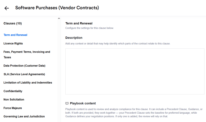 Playbook content for each clause is made up of Precedent language and Guidance. A clause can contain either one or both of these pieces of information. If both are provided, they work together - your Precedent Clause sets the baseline for preferred language, while Guidance defines your negotiation positions. If only one is added, the review will rely on that.