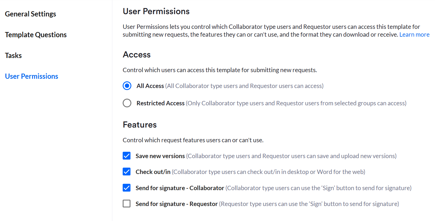 Note: Once enabled a template will be accessible to all users with the Power or Power Pro permission level as well as any collaborator level/Requestor users depending on the configuration of the ‘Access’ section in User Permissions.