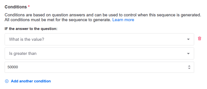 - Determine whether the sequence requires conditionality. If the conditions are met, the sequence is generated (individual tasks in the sequence cannot have their own conditions). If conditions are required, click '+Add condition' and configure the relevant settings (you can find out more information about task conditions in this article)