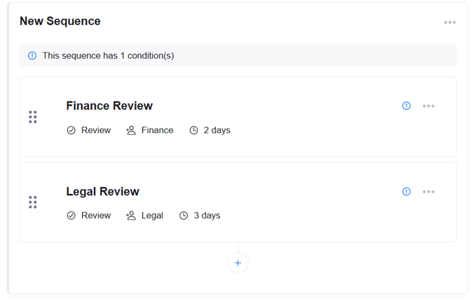 Therefore, task sequences are ideal if you have a linear approval process, whereby certain tasks are only relevant if the request has passed other stages of the process first (for example, purchases over a certain value must be reviewed by the Finance team before the contract is reviewed by Legal).