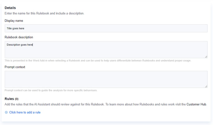 Next, give the Rulebook a name and description. This will be visible to end users when viewing the list of Rulebooks in the Word add-in.