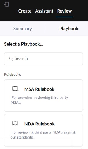 In Review, click on the Playbook tab and your Rulebooks will appear at the top of the list. Here, you will see the names and descriptions of any Rulebooks you have saved: