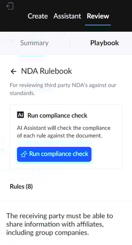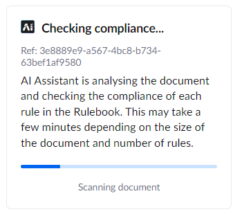 Click 'Run compliance check'. This will start the review process, and will scan the full document against the set of Rules. The time it takes to process will vary depending on the length of the document, the number of rules, and any other AI related activity happening at the same time in your account (e.g. if you're uploading documents or re-processing clause summaries).