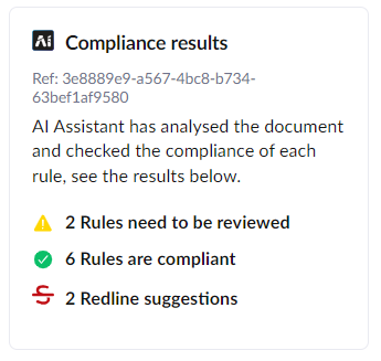 Once complete, you will see a summary of what it has found. In the below example, two of the eight rules need to be reviewed, six are compliant, and based on the rules that need to be reviewed, two redline suggestions have been made: