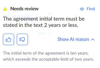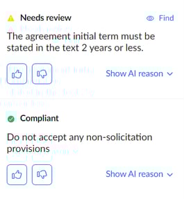 In both the Rule and Redline tab, you will see the option to provide feedback. Providing both positive and negative feedback will give the AI good and bad examples of reviews and redlines compared to your expectations.