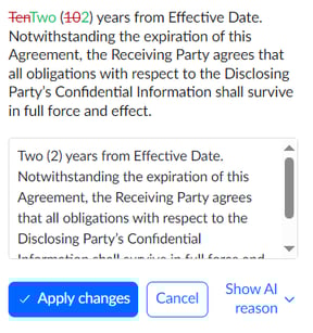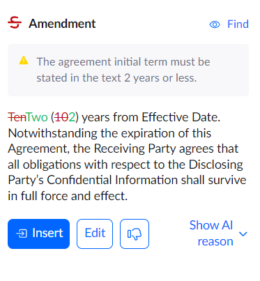 But for positive feedback, we treat the act of accepting and inserting the suggestion as positive, and we store that as a good example of suggested redlines. If you edit the wording before inserting, we store that version, so the AI can use that as an example to use again in the next review.