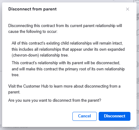 If you have a contract that has its own children, it's not possible to delete it from the family tree as it has dependencies. Instead, you can 'disconnect' the parent from the tree, which will remove any parent relationships the contract in question, but will keep its children.
