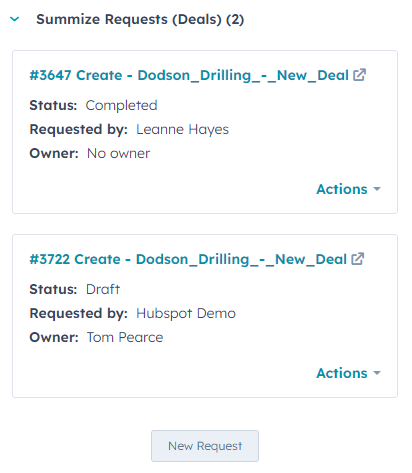 To update a Request, navigate to the Deal or Company that the Request was originally submitted. From here, you can either click on the Request name, which will open the Request in Summize in a new tab, or you can click Actions > View, to open the Request in a pop-up: