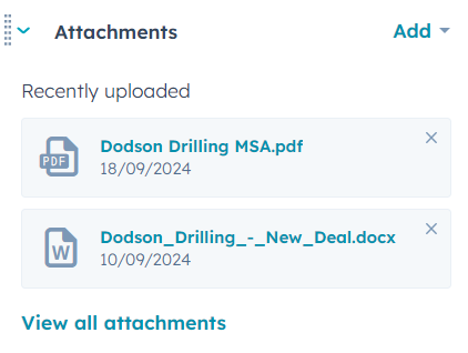 The generated contract, once approved and completed, will also appear in the attachments on the Deal: