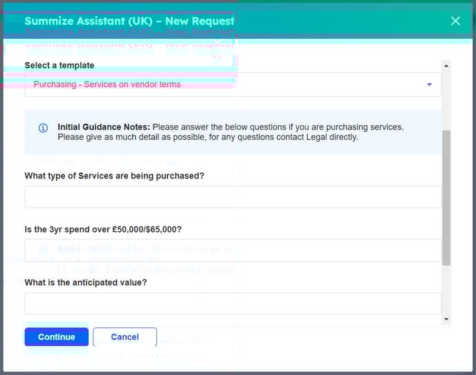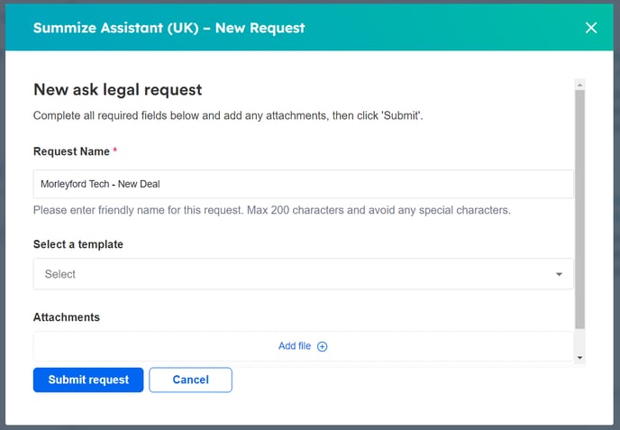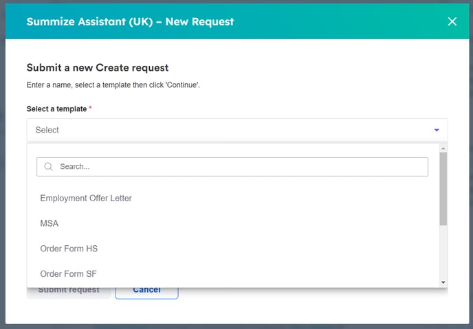 Summize will populate the Request name with the name of the Deal/Company. Select the applicable template: