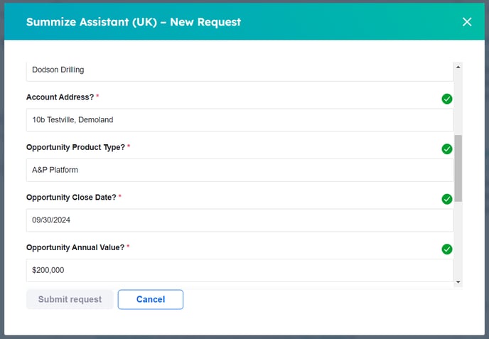 Summize will populate the Request name with the name of the Deal/Company, as well as any pre-mapped fields: