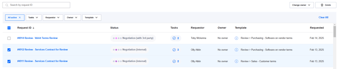When a request or multiple requests are selected using the check boxes, you can use the buttons to the top right of the table to change owner or delete requests.