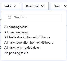 Tasks: Requests can be filtered by the number of tasks that are pending, due soon or overdue. This helps to focus on requests that have the highest level of urgency.