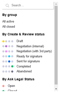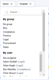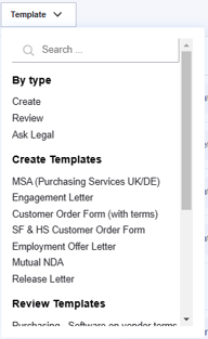 Template: And finally, requests can be filtered by the template that was used to submit them - either by type (Create, Review or Ask Legal) or specific template (e.g. NDA).