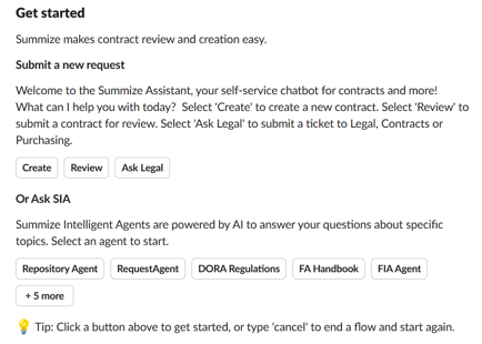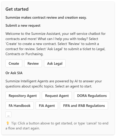 When opening the Teams or Slack chat bots, you will see a section for Ask SIA at the bottom of the 'Get started' message.