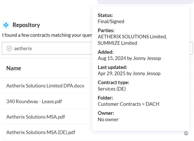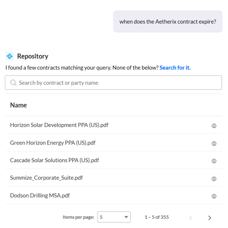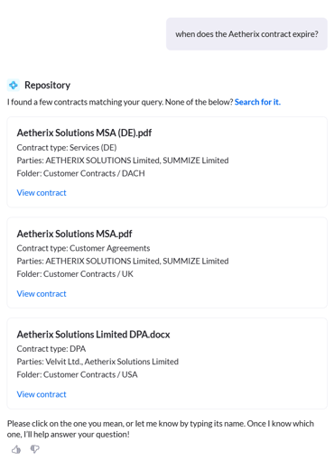 Beneath each response the Repository Agent provides, you will see a card which states the contract name, contract type, extracted parties, and the folder it's stored in.
