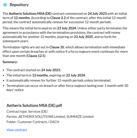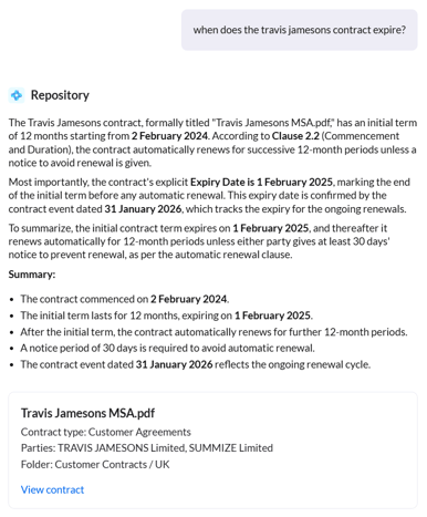 The Repository Agent specialises in answering questions about a signed contract in the Summize Repository, so you can retrieve critical information in seconds. Questions can be asked about one contract at a time.