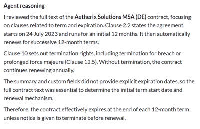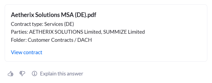 To understand why the Repository Agent provided a certain response, click 'Explain this answer' beneath the contract card. This will open a panel which outlines the Agent's reasoning. Here, the Agent will outline where it found the answer and why it came to that conclusion: