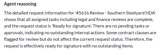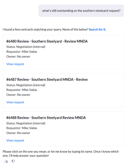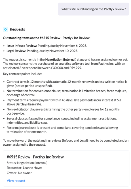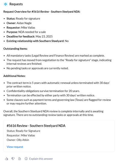 The Request Agent can answer questions about a single request at a time, such as "What's still outstanding on the [counterparty] request". The Request Agent cannot answer questions about multiple requests at a time, for example "Show me all the requests assigned to me"