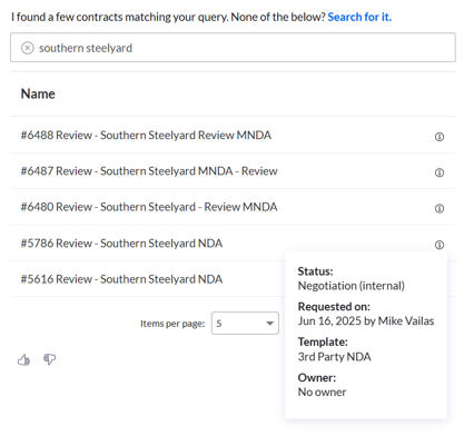 Note: Your data is never used to train or retrain the Agent or any underlying AI models. Summize may review feedback trends (e.g., frequency of thumbs up versus down) to identify areas for improvement, but all analysis is done within our secure environment and does not involve sharing or reusing your contract data outside your tenant.