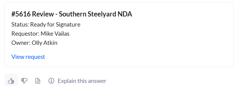 The Request Agent specialises in answering questions about pre-signature requests, so you can retrieve information and updates in seconds. Questions can be asked about one request at a time.