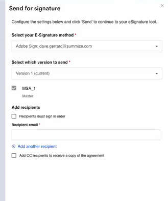 This integration ensures that you can send contracts from Summize to Adobe Sign for eSignature and that signed contracts are automatically sent back from Adobe Sign into your Summize Inbox or Repository